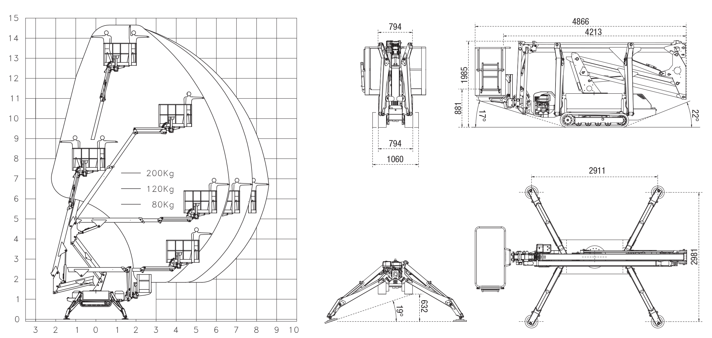 Вылет стрелы/грузоподъемность (м/кг) 8.70/80-7.80/120-6.70/200
